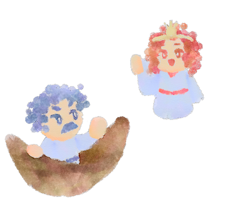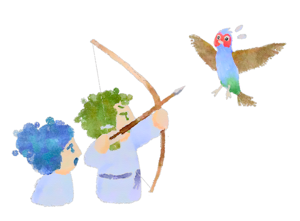 弓と矢をもたせて、地上に送り出しました。