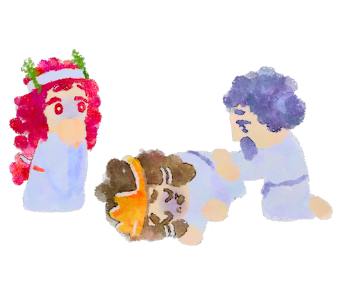 わたしたちは海をまもる住吉三神の神さまです。