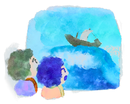 は赤ちゃんを大切におなかにかかえたまま、男の人のかっこうをし、大きな船にのって海へとびだしました。